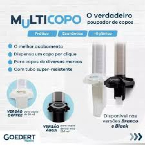 Multicopo, o verdadeiro poupador de copos. Dispensador de copos descartáveis para café, tamanhos de até 50ml. Capacidade do Tubo: O tubo comporta até 100 copos. Prático, econômico e higiênico e com um botão que dispensa apenas um copo por vez, o Multicopo tem tamanho compacto e aparência discreta que não polui o ambiente. Tubo sem emendas, tornando o tubo uma peça única, sem recortes. A tecnologia do Multicopo proporciona um copo por clique. Com um sistema de clique único, ele ativa as pequenas engrenagens de separação que geram a divisão perfeita dos copos armazenados no tubo. Isso além de bom para o meio ambiente, é excelente para o bolso na hora da economia. Cor: Branco com tecla branca Inclusos no produto: 1 base para saída dos copos 1 Tubo para copos descartáveis de café 1 tampa 4 parafusos 4 buchas 1 manual de instalação e utilização
